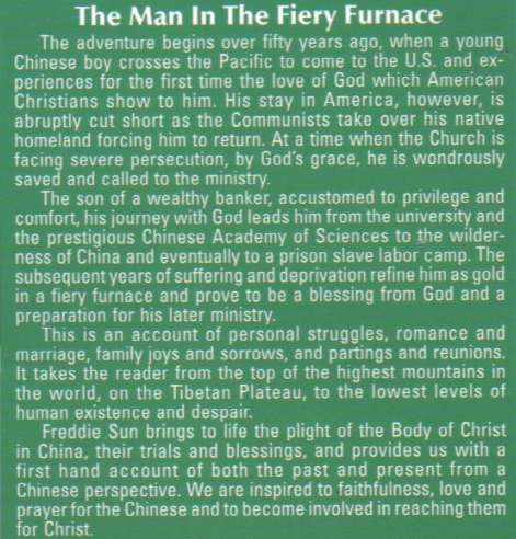 Read this free iBook - The Man In The Fiery Furnace The compelling true story of Freddie Sun The extraordinary adventure of a courageous Christian man imprisoned by the Communists during the nightmare years of China's Cultural Revolution. Table of Content ![]() ![]() |